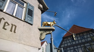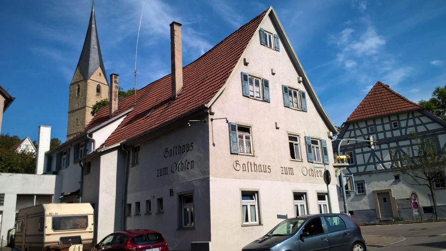 Von Schnait bis Marbach sind es nur 25 km. Pünktlich zur Mittagszeit erreichen wir deshalb den Gasthof Ochsen, um unseren Mittagsappetit zu stillen. Von einem richtigem Hunger kann nämlich an sich keine Rede sein nach der ausgiebigen Brotzeit in Schnait. Die Speisen sind schon seit langem individuell vorbestellt.