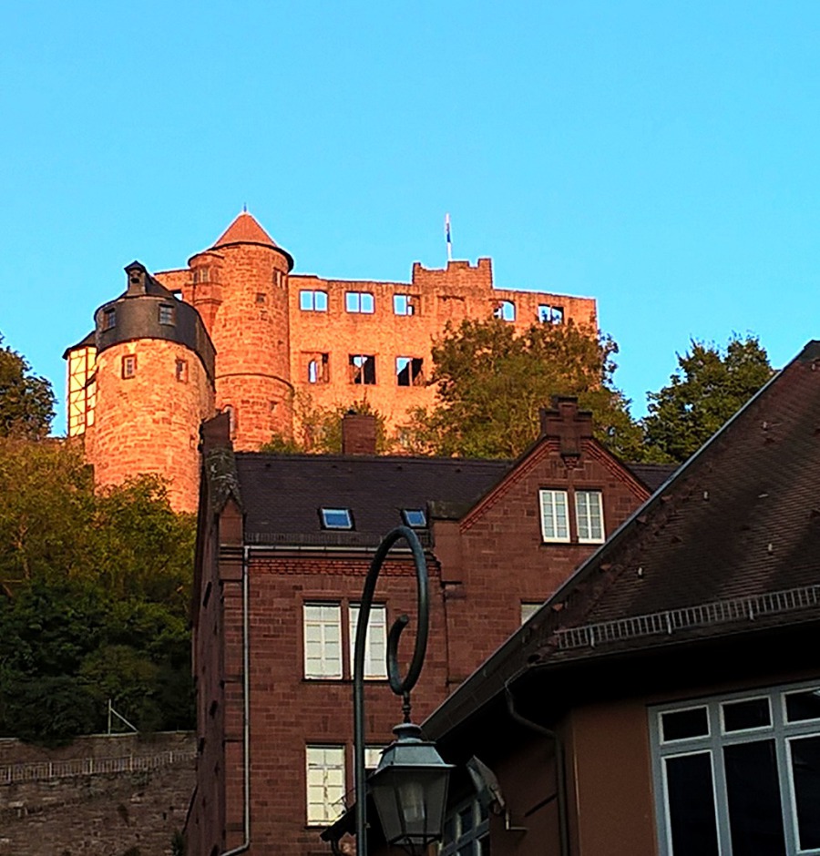 Ein Reisetag voller Eindrücke geht langsam seinem Ende entgegen. Die Abendsonne vergoldet den Anblick der Burgruine Wertheim hoch über der Stadt, als unser Bus zur letzten 32 km-Strecke des Tages nach Dittigheim startet.
