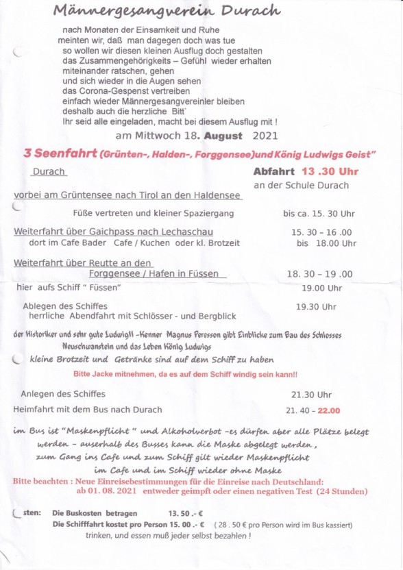 Nach längerer Coronabstinenz und immer noch anhaltenden Hygiene-massnahmen kommt unser Sängerkollege Georg Wagner mit dem Plan eines Halbtagesausflugs auf uns zu. Da zu gibt es nicht viel zu überlegen, und wir nehmen den Vorschlag gerne an.