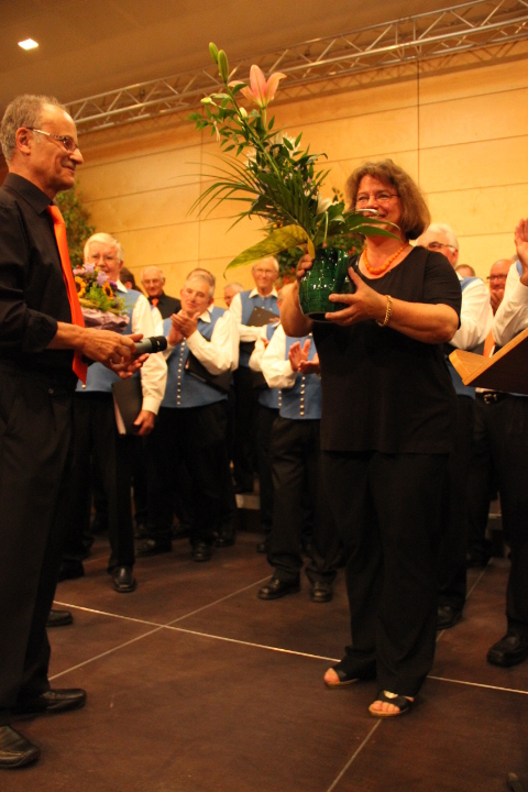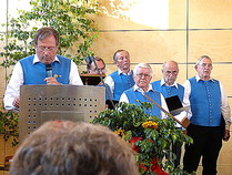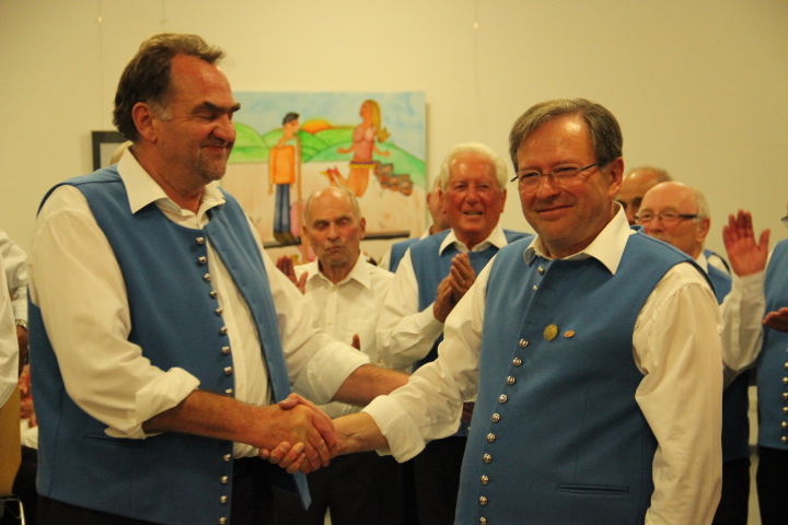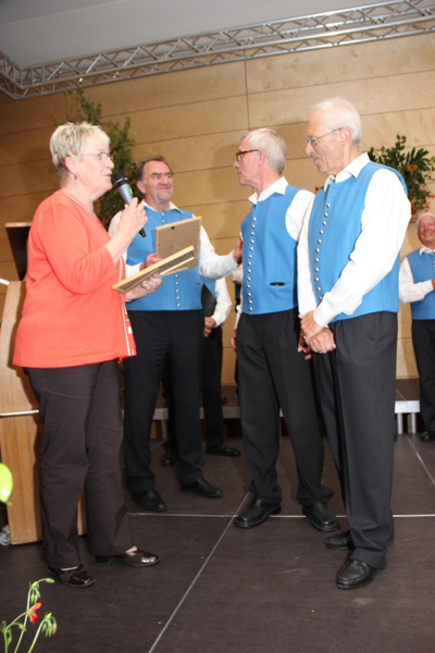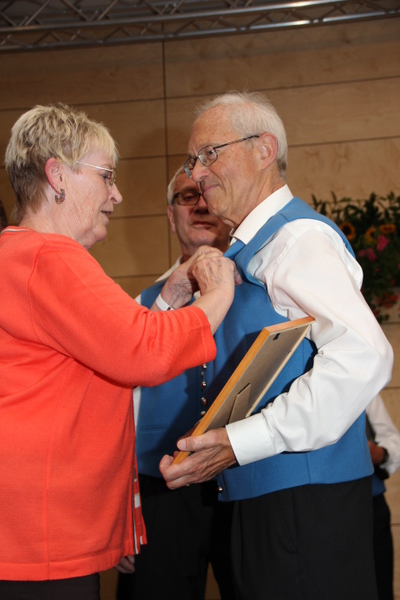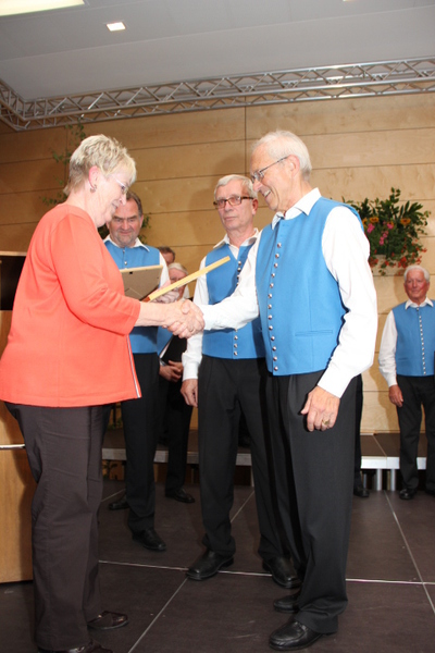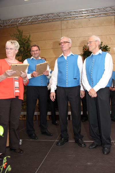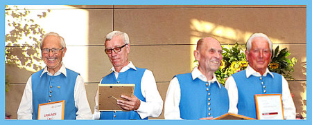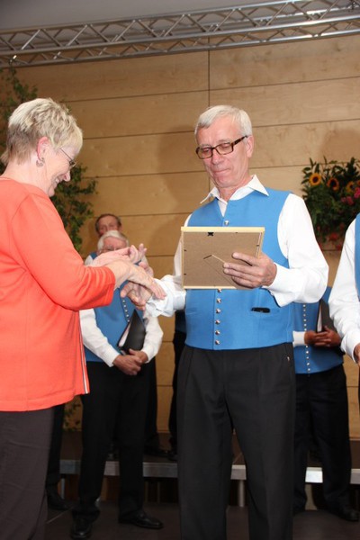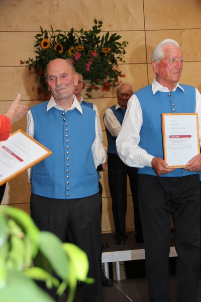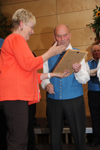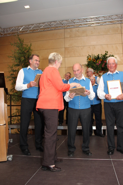 Durch die Vorsitzende des Kreis-Chorverbandes, Frau Helga Foitzik, wurden nach der Konzertpause vier Mitglieder des Männergesang - vereins für ihre langjährige Zugehörigkeit geehrt - dies waren Erich Birk und Heinrich Zick für 65 Jahre aktives Singen im Chor, sie erhielten eine Urkunde und die Ehrennadel in Gold vom Deutschen Chorverband, sowie Manfred Böhm und Ludwig Mitterer für 40 Jahre aktives Singen im Chor. Ihnen wurde eine Urkunde und die Ehrennadel in Silber vom Chorverband Bayerisch - Schwaben verliehen.