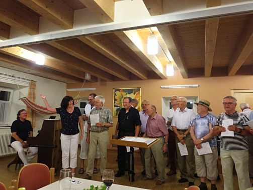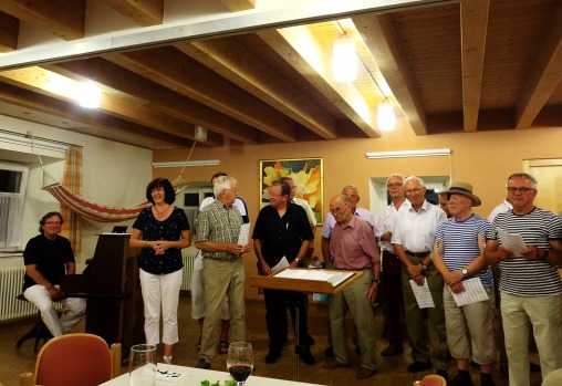 Mit diesem Sommerfest endet das erste Chorhalbjahr. Morgen beginnen die Sommerferien. Und heute wird gefeiert. Und anders als bei unseren Sommerfesten in den vergangenen Jahren braucht man sich wegen des Wetters keine Gedanken zu machen. Die Eröffnung des Festes findet deshalb mit einer Stehparty im schönen Garten des Duracher Pfarrheimes statt, denn schon seit Wochen kennt der Himmel nur die Farbe Blau, und heute hat die bereits tiefstehende Sonne zum Festbeginn um 19.OO Uhr noch gute 28 Grad im Angebot.