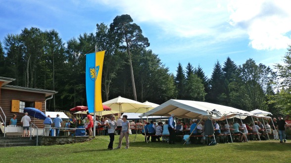 Allgemeines Aufatmen, als wir schließlich mit ca. halbstündlicher Verspätung im Zielort eintreffen. Nur noch ein kurzer Fußmarsch bergauf und dann sind wir auf dem weitläufigen, schönen Vereinsgelände der Augsburger Sängerfreunde angekommen.