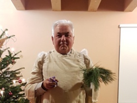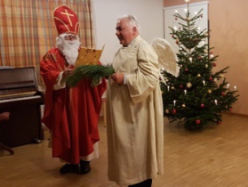 Was war das? Stille im Saal, der Heilige Nikolaus war im Anzug und wen hatte er da im Gefolge? Oh, ein Engelein oder war es Aloisius ? Egal, der Auftritt war gelungen; die Anwesenden folgten gespannt den Ausführungen des Hl. Nikolaus (Georg Wagner), nahmen ein kleines Geschenk für besondere Dienste in Empfang und lachten vergnügt über den Engel ( Herbert Stiefenhofer). Am Ende gab es für alle noch einen Nikolaus. Da kam Freude auf.