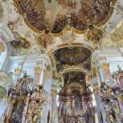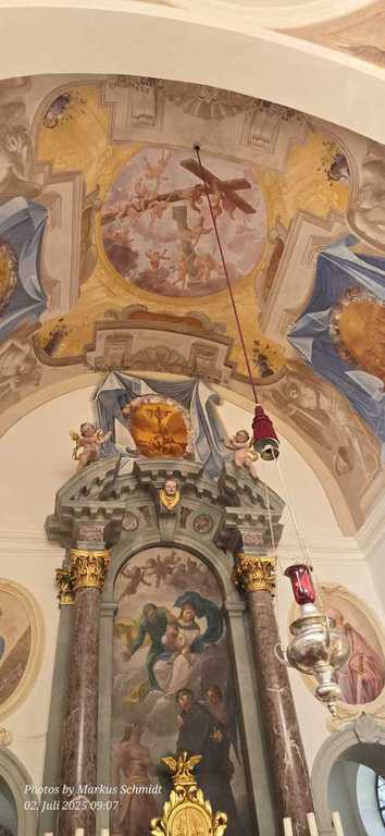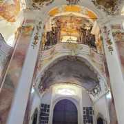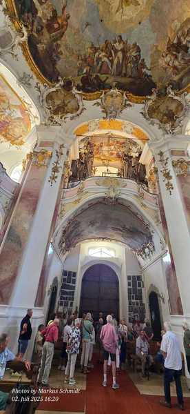Er verstand es, uns mit seinem profunden Wissen um die Bilder, ob an den Wänden oder an den gewaltig hohen Gewölbe -decken, überzeugend zu fesseln. Er lenkte unsere Aufmerksamkeit auf die unzähligen Dankesbezeugungen von Wallfahrern aus nah und fern, die ihre persönlichen Gotteserfahrungen in Notlagen um Leben und Tod auf Votivtafeln verewigt hatten, und wusste Geschichten zu erzählen über tragische Schicksale, die sich hinter den Votivtafeln verbargen.