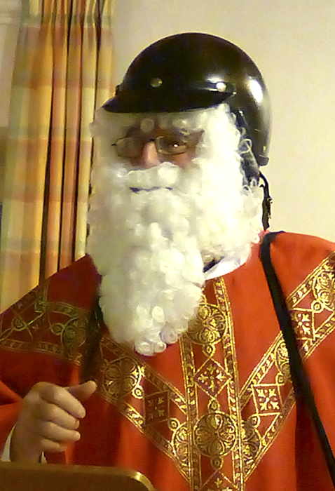 Nikolaus tauscht geschwind Motorradhelm gegen Mitra und beginnt seinen Vortrag – wie immer in Versform - mit diesem gesungenen Vierzeiler (Melodie: Wem Gott will rechte Gunst erweisen...):